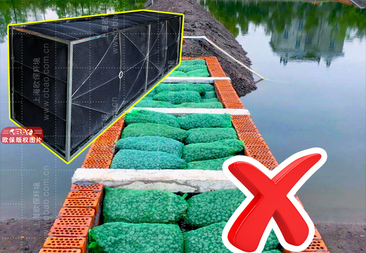 在沉淀池与曝气池之间建设过滤坝,传统坝体中填充大小不一的滤料,如碎石、鹅卵石、小石子、棕片、陶瓷珠等填充物介质,能起到一定的吸附污水中的泥浆、脏物和微生物菌类的作用。但是过滤介质很快堵塞导致短流现象发生,过滤坝的功效明显下降,甚至失去净水效果。